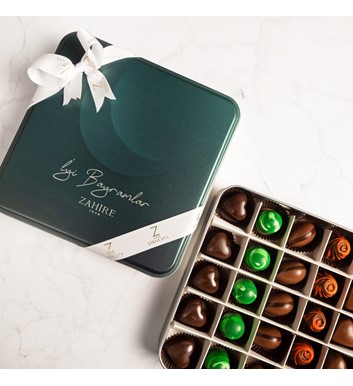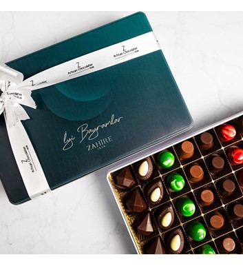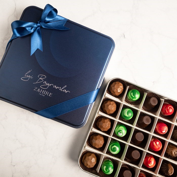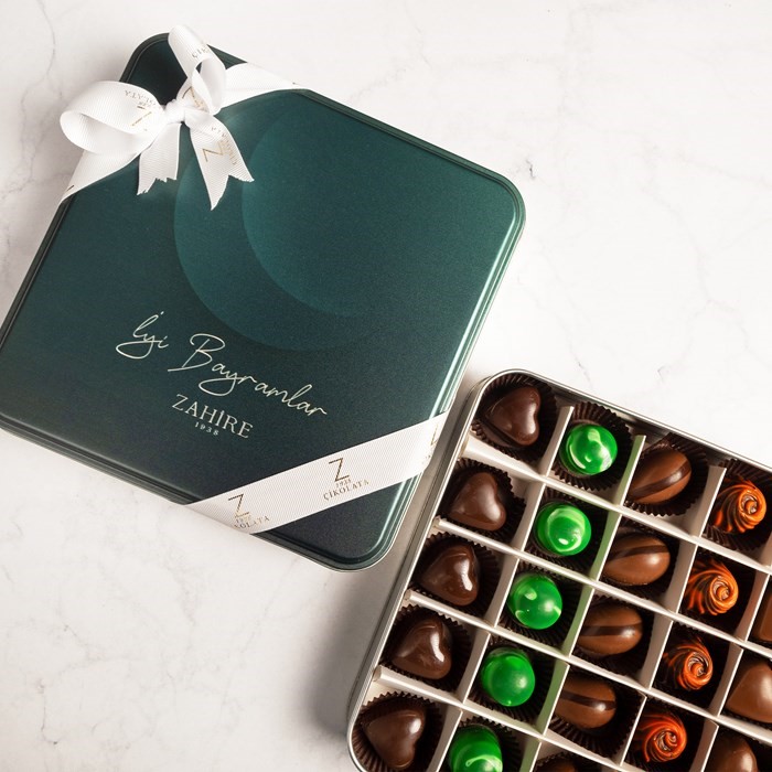 Bayrama özel “İyi Bayramlar” yazılı teneke çikolata kutuları. Yeşil ve mavi renk seçenekleriyle kare ve dikdörtgen formlarda sunulur.
