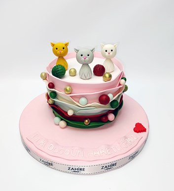 Kedi temalı şeker hamurlu tasarım butik doğum günü pastası