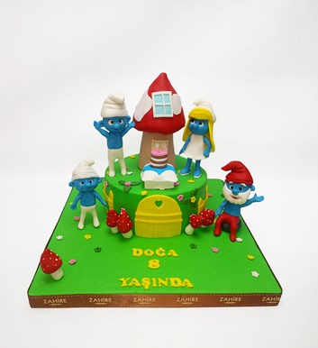 Şirinler temalı şeker hamurlu tasarım butik doğum günü pastası