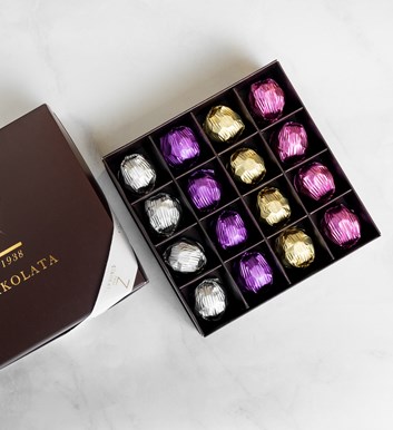 16 Adet yalıdızlı çikolata içerir,yaldızlı çikolatalarımız sütlü fıstıklı pral çeşidi olarak üretilmektedir